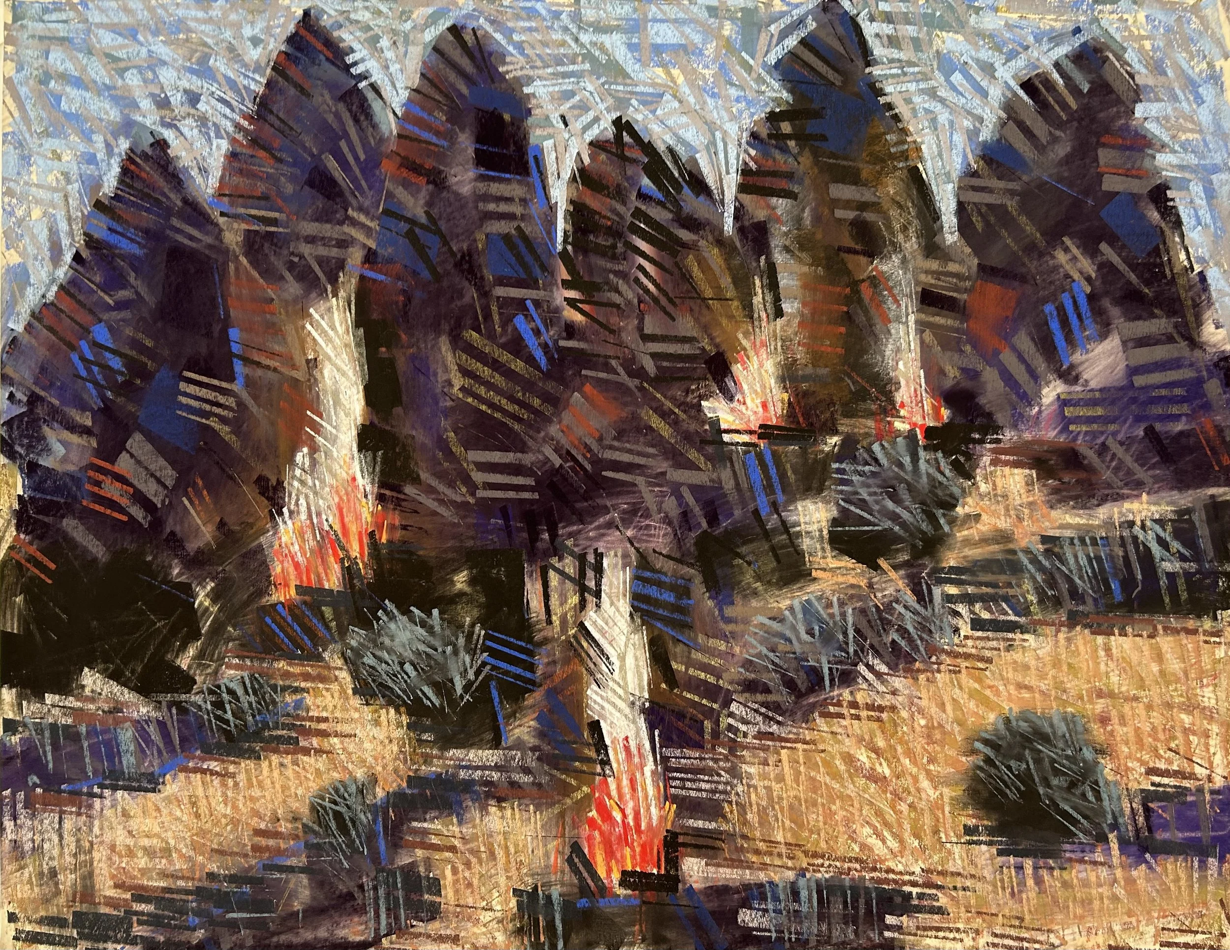 “One such event was the 2022 Calf Canyon/Hermits Peak fire which was just to the south of Dixon. Impressive in the huge volumes of smoke and ash that were in the air and water and brought to the forefront how close we live to disasters that often as not are manmade. Some of the pastels on exhibit here were started in the aftermath of the fires which followed the covid outbreak with the accompanying political conflagration, the subsequent invasion of the Ukraine, the disastrous attack by Hamas in Israel and the military rampages in Gaza resulting in the death and suffering of tens of thousands of women and children. The landscapes are an attempt to depict the small and large detonations that devastate our civilization while the portraits are a similar attempt to find a way to speak to the atrocities presently being carried out in the Middle East. A small success in this attempt is the best that I can hope for.”